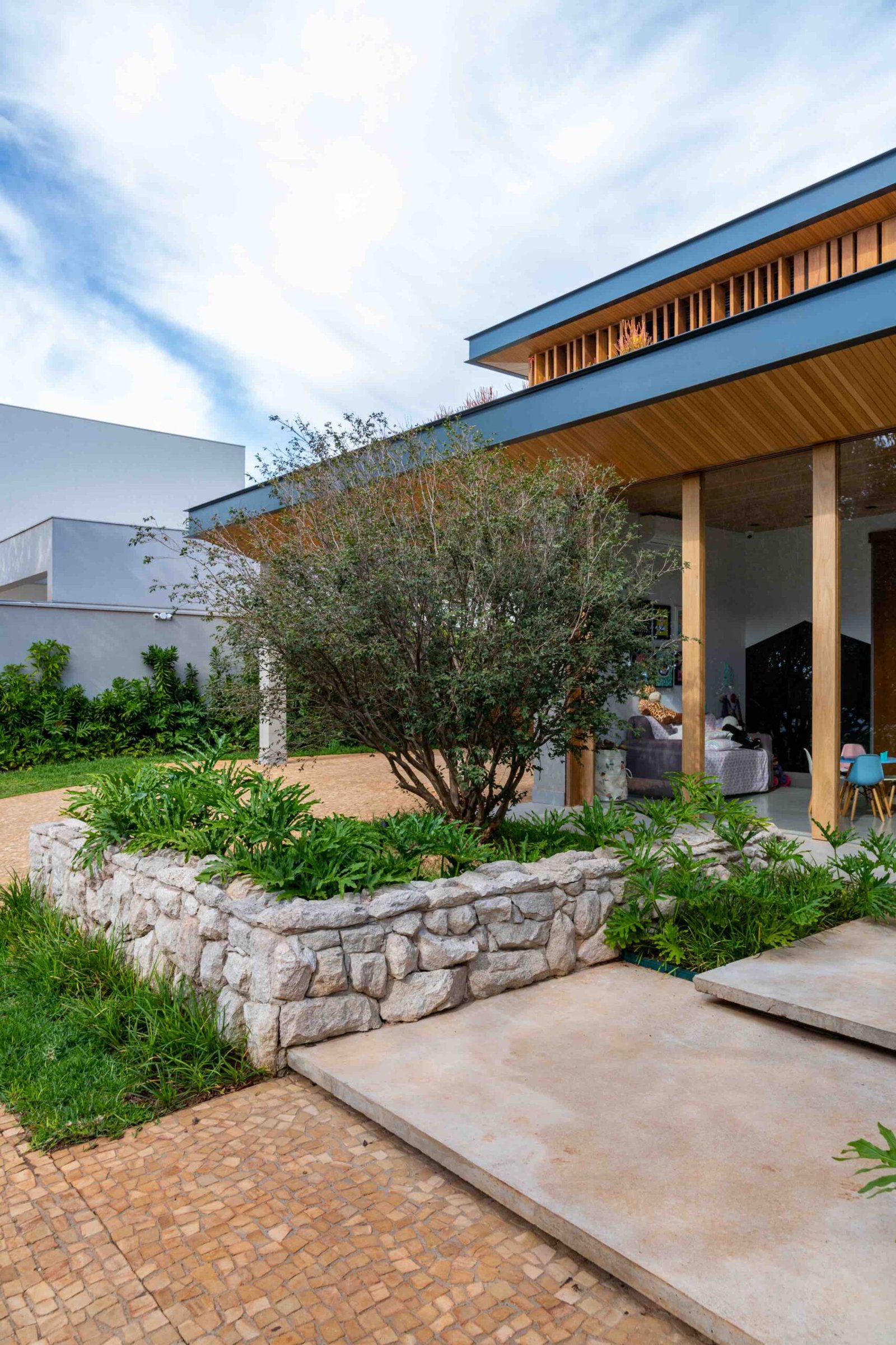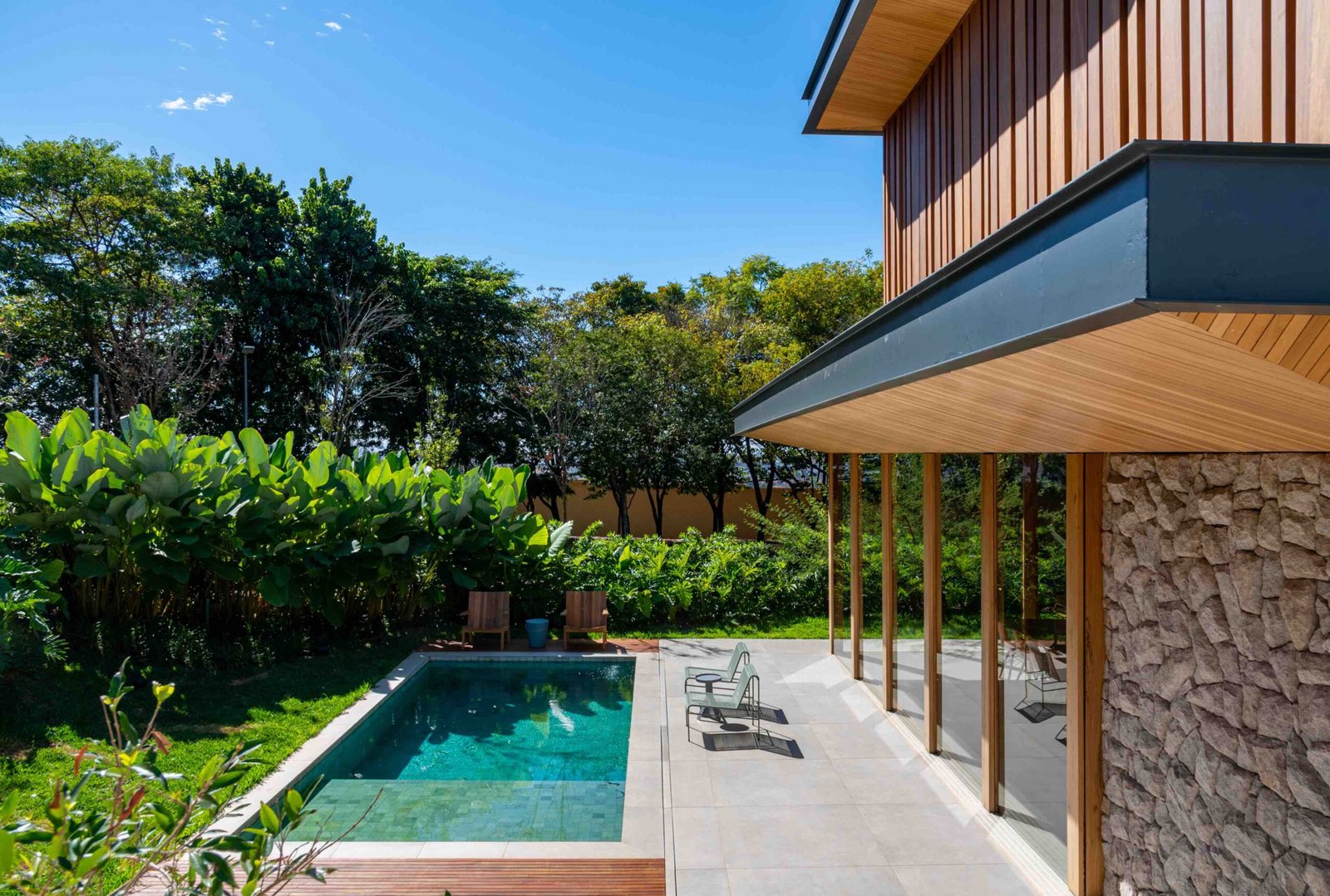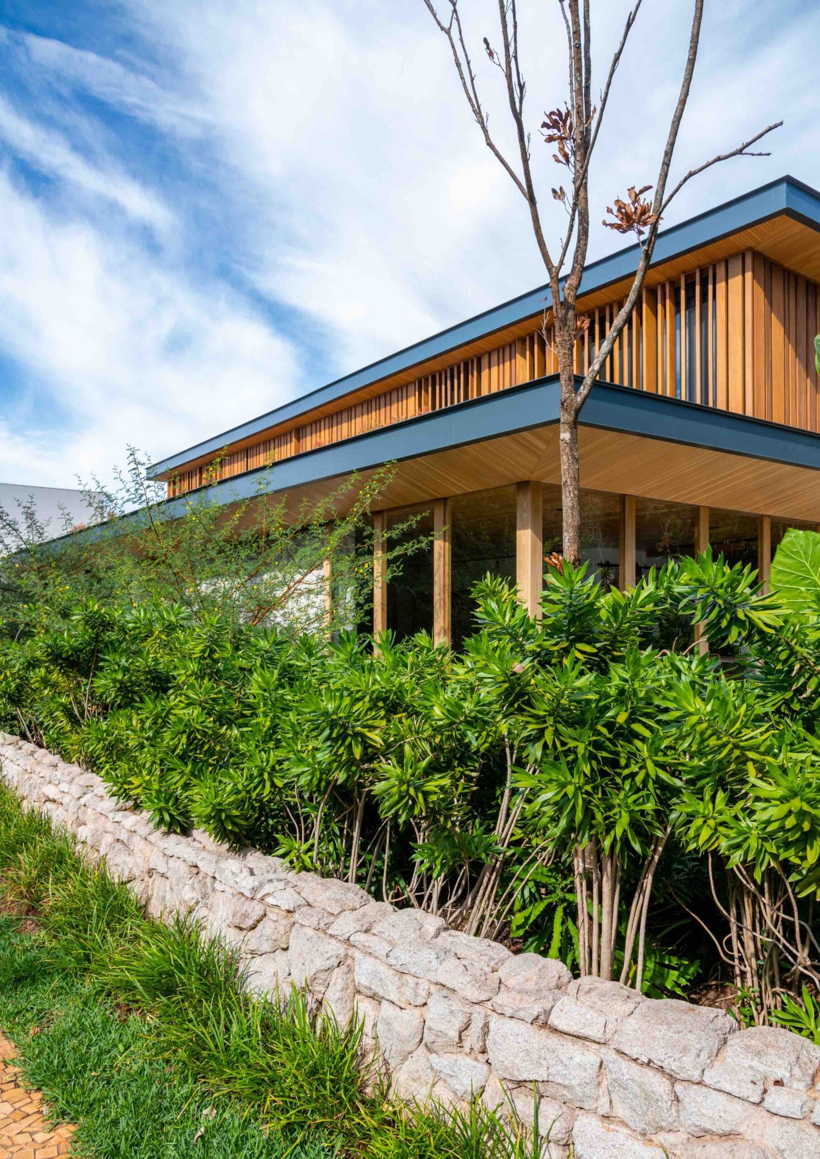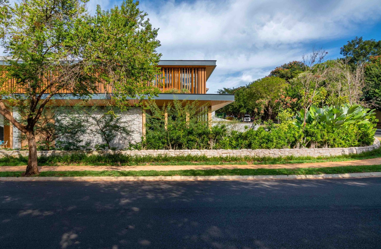 O projeto da casa visa integrar a arquitetura com a natureza ao redor, aproveitando a localização em um terreno de esquina para abrir duas fachadas com vistas para a área verde e, no piso superior, para a cidade de Ribeirão Preto. A preocupação com o clima quente levou à criação de brises pivotantes para melhorar o conforto térmico e otimizar as vistas. O pavimento térreo é voltado para a área social, com uma integração fluida ao jardins, além de uma calçada que circunda a casa. Detalhes como portas de trilhos ocultos e forros de madeira reforçam a leveza e o aconchego. No piso superior, a madeira é utilizada no piso para manter a sensação acolhedora. A estrutura metálica permite grandes vãos e integração entre os ambientes internos e externos. A área gourmet, com ar condicionado, foi projetada para conforto no calor, e a piscina com deck de madeira harmoniza com a natureza. O uso de brises, janelas ventiladas e vidros especiais contribui para o conforto térmico nos quartos. O projeto também contou com um ambiente funcional, aconchegante e ideal para a convivência familiar.