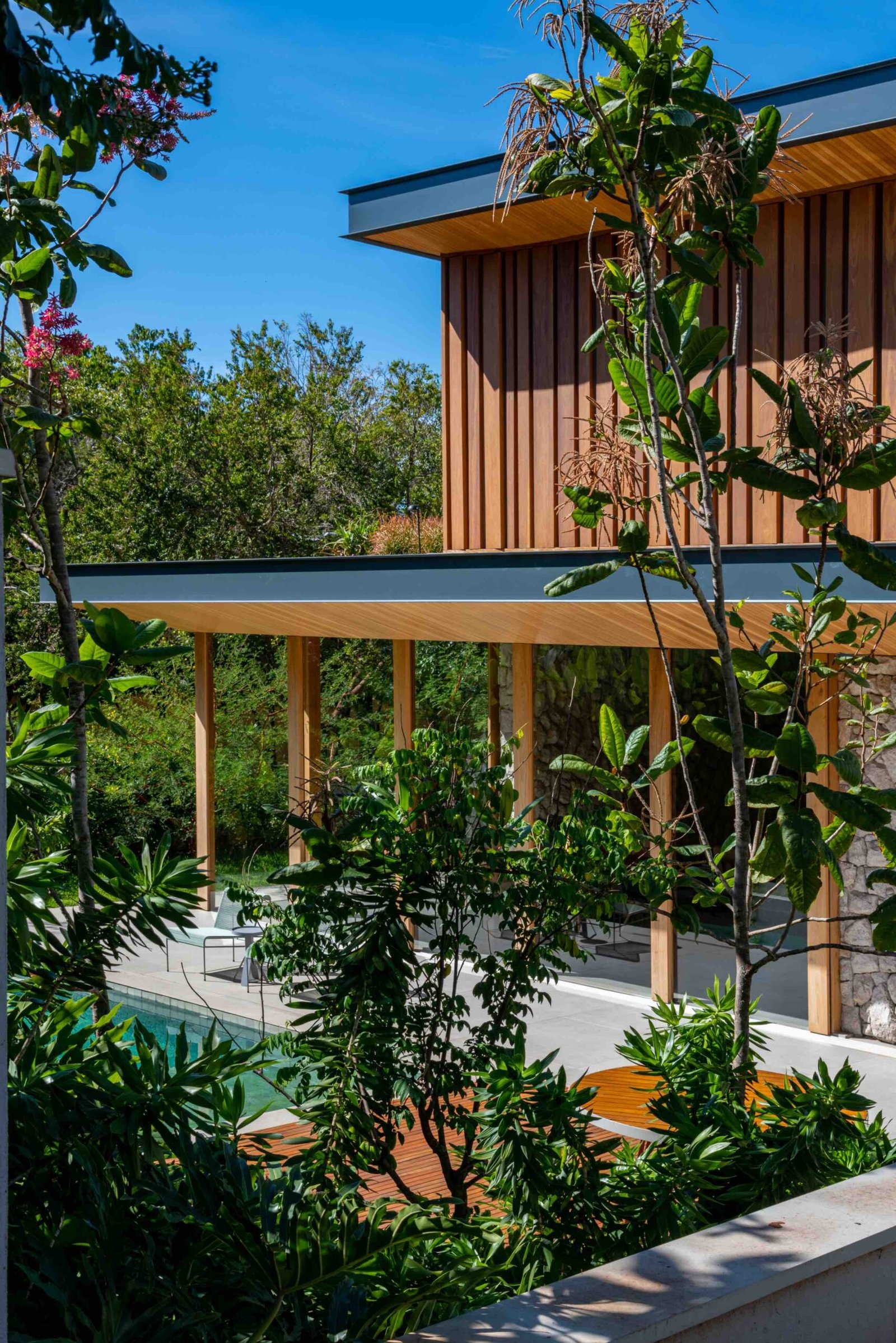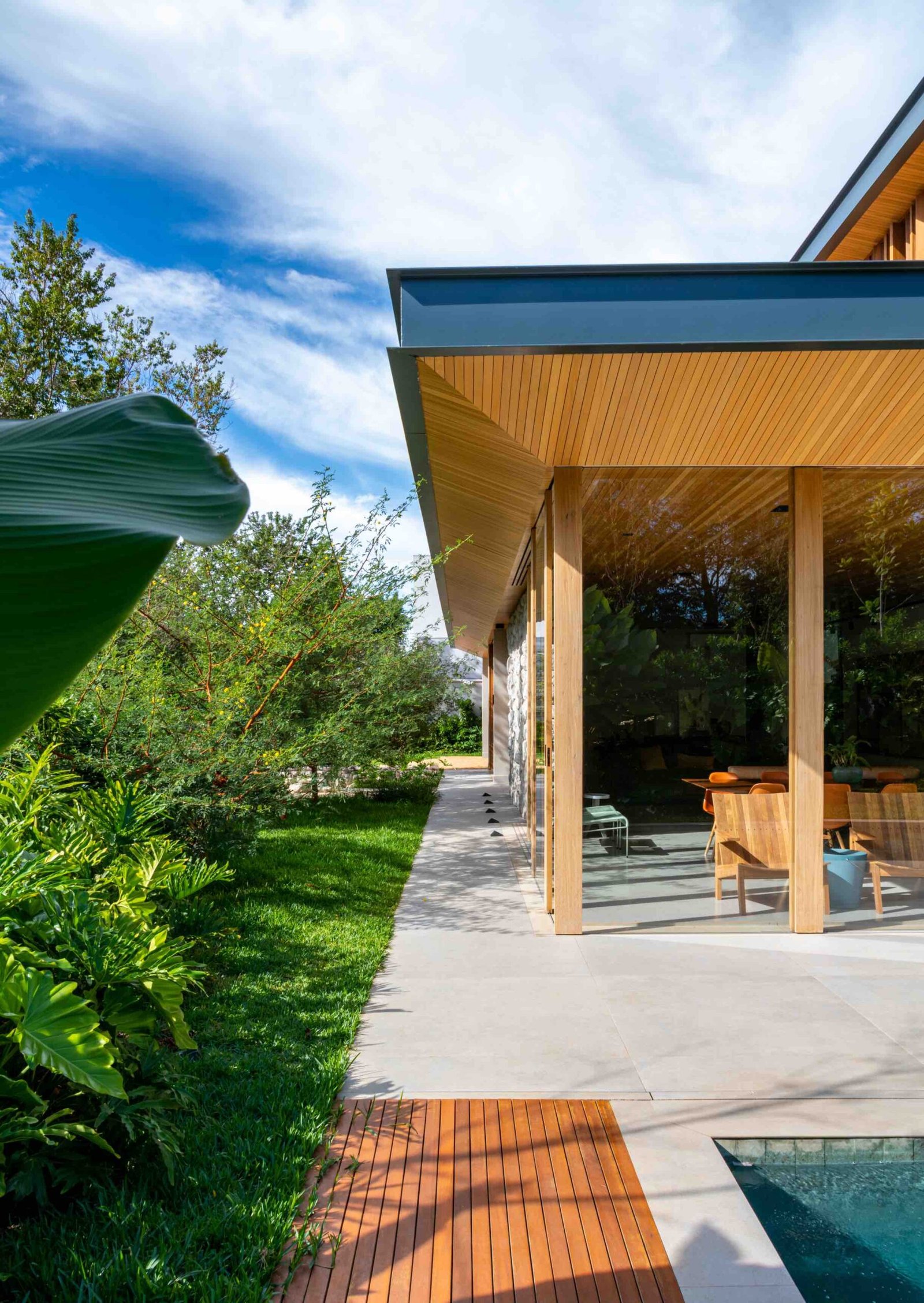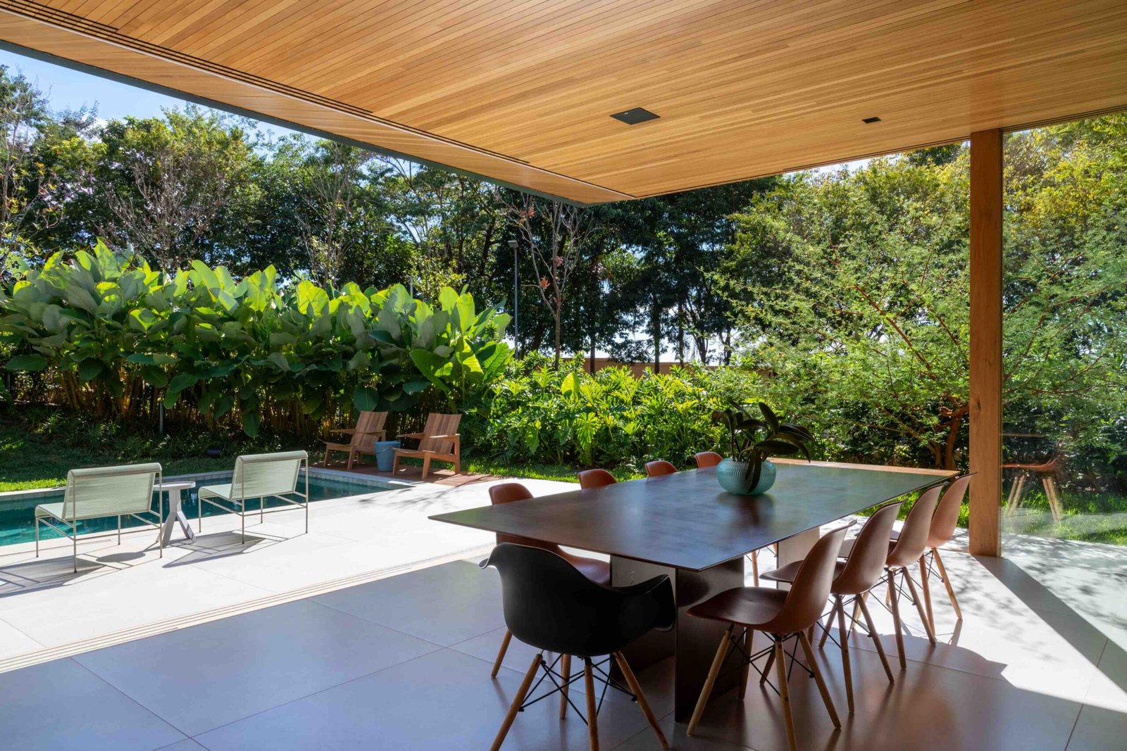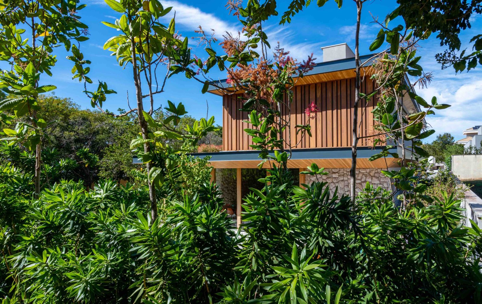 O projeto da casa visa integrar a arquitetura com a natureza ao redor, aproveitando a localização em um terreno de esquina para abrir duas fachadas com vistas para a área verde e, no piso superior, para a cidade de Ribeirão Preto. A preocupação com o clima quente levou à criação de brises pivotantes para melhorar o conforto térmico e otimizar as vistas. O pavimento térreo é voltado para a área social, com uma integração fluida ao jardins, além de uma calçada que circunda a casa. Detalhes como portas de trilhos ocultos e forros de madeira reforçam a leveza e o aconchego. No piso superior, a madeira é utilizada no piso para manter a sensação acolhedora. A estrutura metálica permite grandes vãos e integração entre os ambientes internos e externos. A área gourmet, com ar condicionado, foi projetada para conforto no calor, e a piscina com deck de madeira harmoniza com a natureza. O uso de brises, janelas ventiladas e vidros especiais contribui para o conforto térmico nos quartos. O projeto também contou com um ambiente funcional, aconchegante e ideal para a convivência familiar.