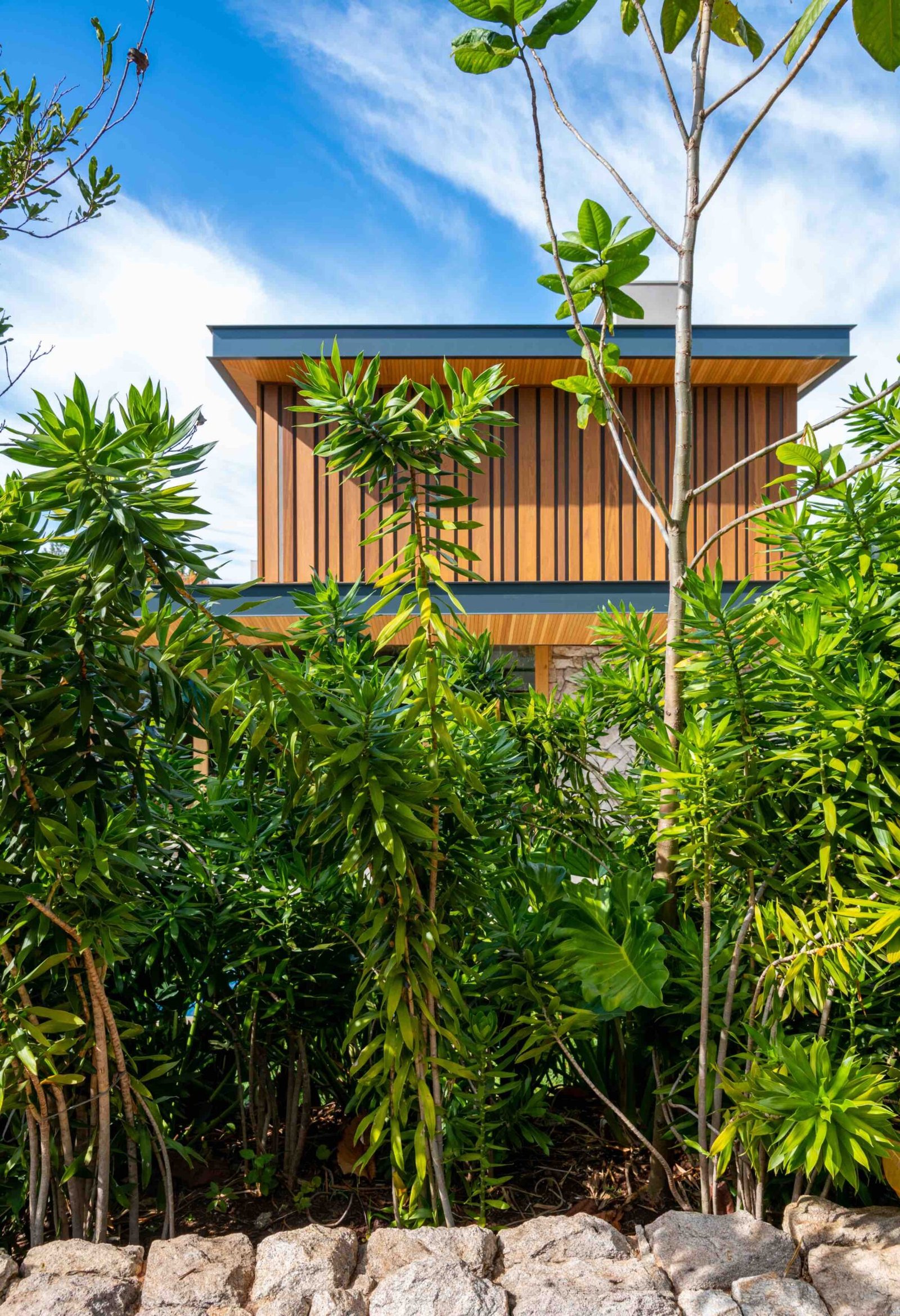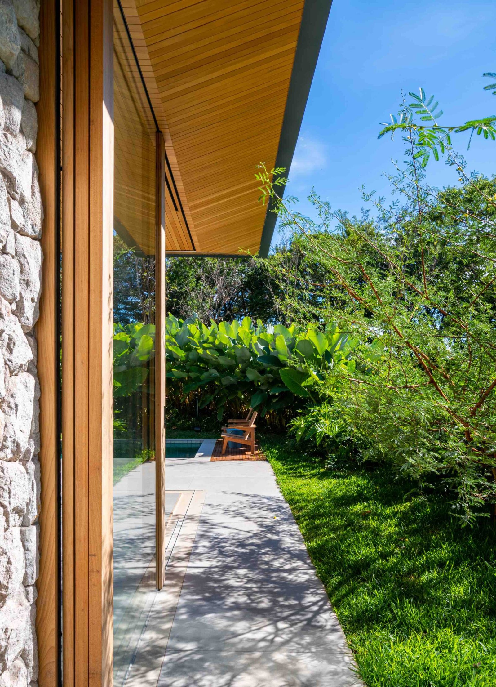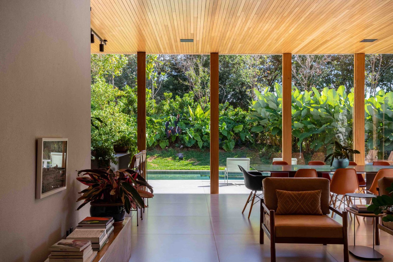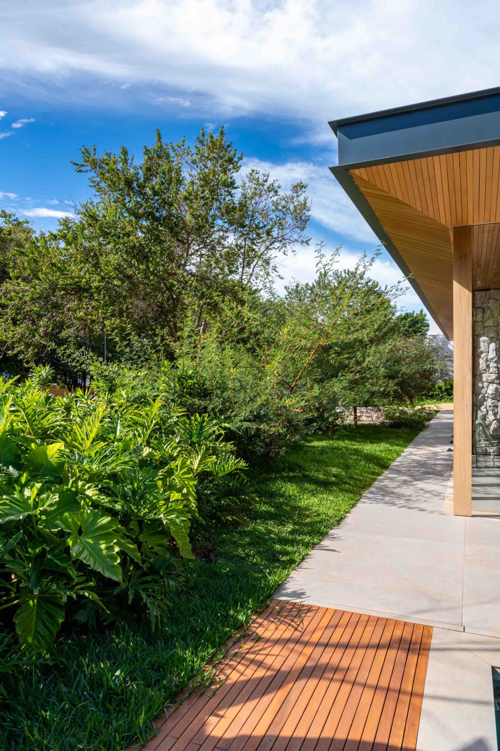 O projeto da casa visa integrar a arquitetura com a natureza ao redor, aproveitando a localização em um terreno de esquina para abrir duas fachadas com vistas para a área verde e, no piso superior, para a cidade de Ribeirão Preto. A preocupação com o clima quente levou à criação de brises pivotantes para melhorar o conforto térmico e otimizar as vistas. O pavimento térreo é voltado para a área social, com uma integração fluida ao jardins, além de uma calçada que circunda a casa. Detalhes como portas de trilhos ocultos e forros de madeira reforçam a leveza e o aconchego. No piso superior, a madeira é utilizada no piso para manter a sensação acolhedora. A estrutura metálica permite grandes vãos e integração entre os ambientes internos e externos. A área gourmet, com ar condicionado, foi projetada para conforto no calor, e a piscina com deck de madeira harmoniza com a natureza. O uso de brises, janelas ventiladas e vidros especiais contribui para o conforto térmico nos quartos. O projeto também contou com um ambiente funcional, aconchegante e ideal para a convivência familiar.