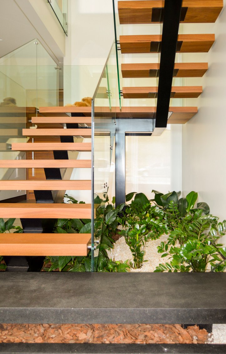 No interior, a escada se destaca como um elemento central, com pisadas em madeira, estrutura metálica preta e peitoril de vidro, garantindo leveza e transparência ao ambiente. Abaixo da escada, um jardim interno complementa a estética da casa, trazendo frescor e integração com a natureza.
