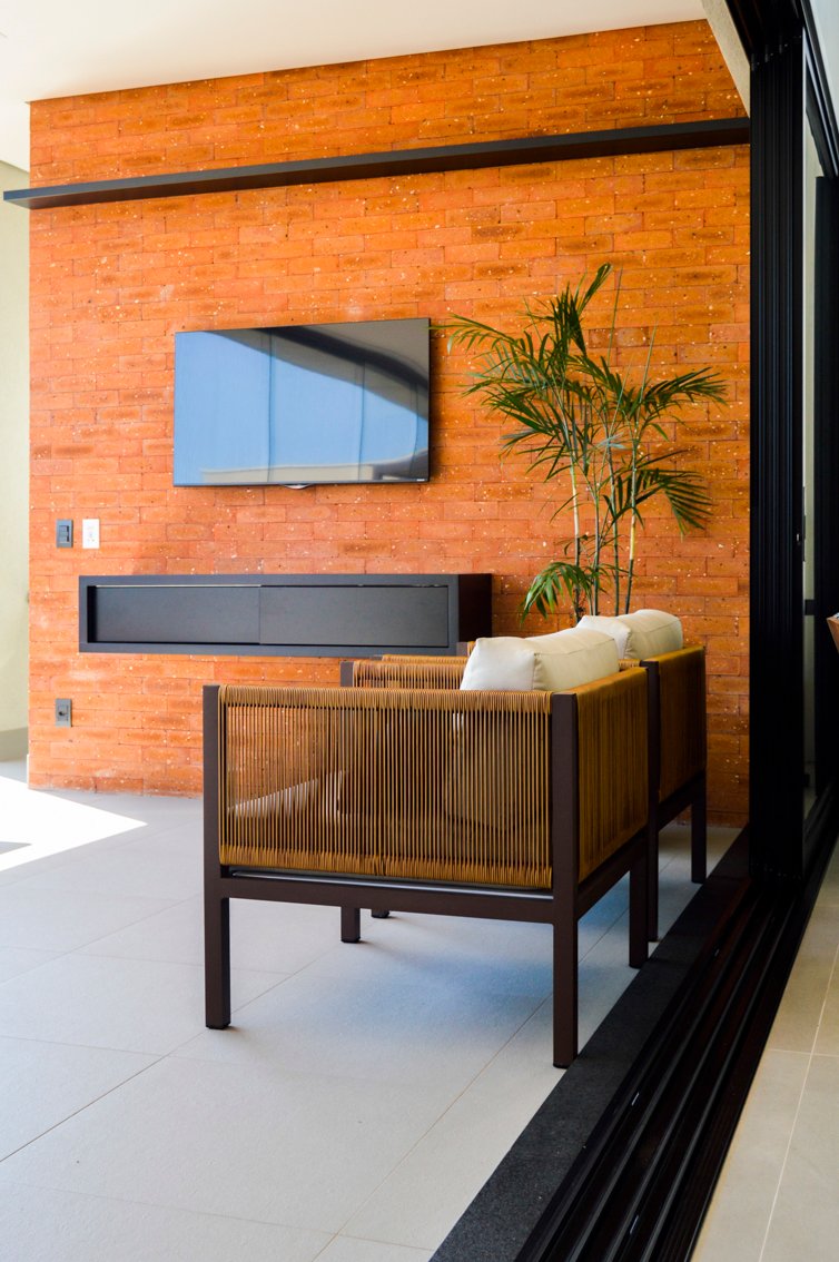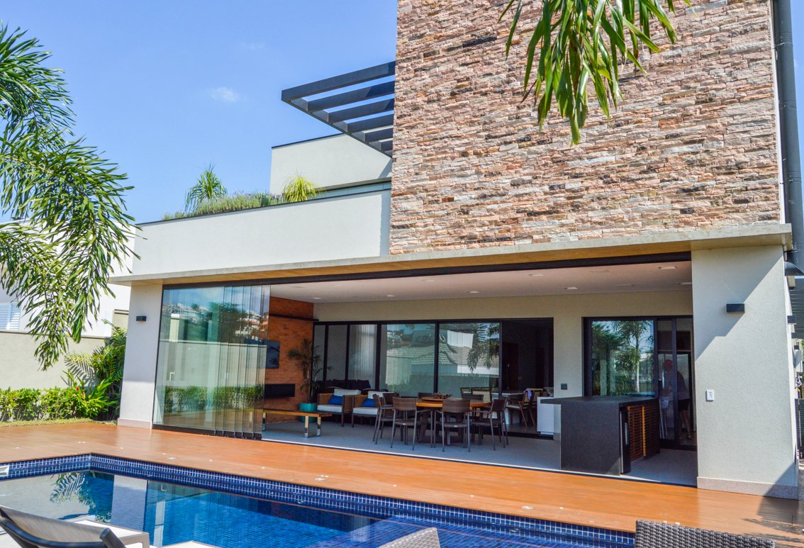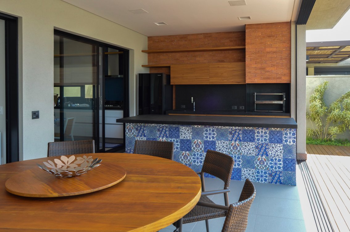 A área gourmet se conecta perfeitamente com o exterior através de esquadrias retráteis, que se abrem por completo, dissolvendo os limites entre o interior e a paisagem ao redor. Essa integração valoriza a piscina e o entorno, proporcionando uma experiência de convivência única e harmoniosa.