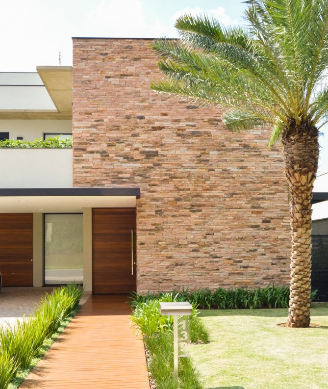 O acesso à residência é valorizado por um caminho de madeira, cercado por um paisagismo discreto e bem planejado, que conduz os visitantes até a porta de entrada de madeira maciça, um elemento que reforça a sensação de acolhimento. No pavimento superior, uma jardineira embutida adiciona verde à fachada, suavizando as linhas arquitetônicas e promovendo um toque de natureza.