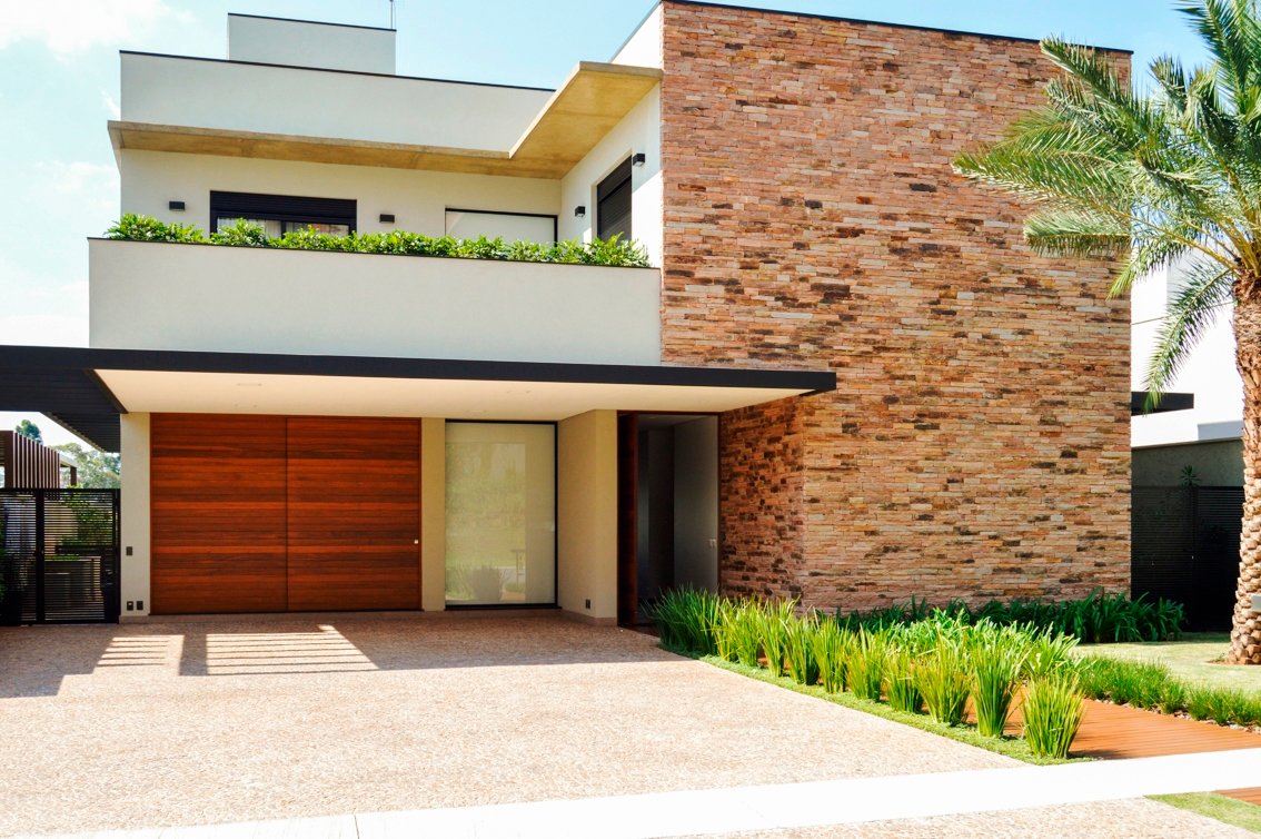 A Casa Elementos apresenta uma arquitetura de linhas retas e um design atemporal que combina materiais naturais e modernos. A fachada principal é marcada pelo revestimento em filete de pedra madeira, conferindo textura e um charme rústico à composição. O tom predominante da casa é o branco, contrastado com detalhes em preto, criando um visual sofisticado e contemporâneo.