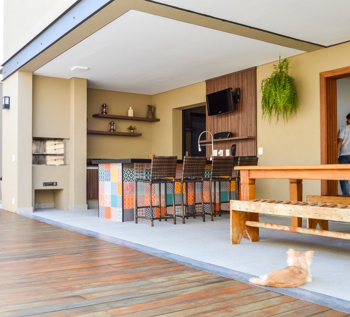 Na área gourmet, a bancada é revestida com ladrilhos coloridos, que trazem um toque vibrante e acolhedor, contrastando com a sobriedade das vigas de metal e o forro de gesso. Essa casa é um exemplo perfeito de como elementos modernos e naturais podem se combinar para criar um ambiente funcional, acolhedor e visualmente impressionante.