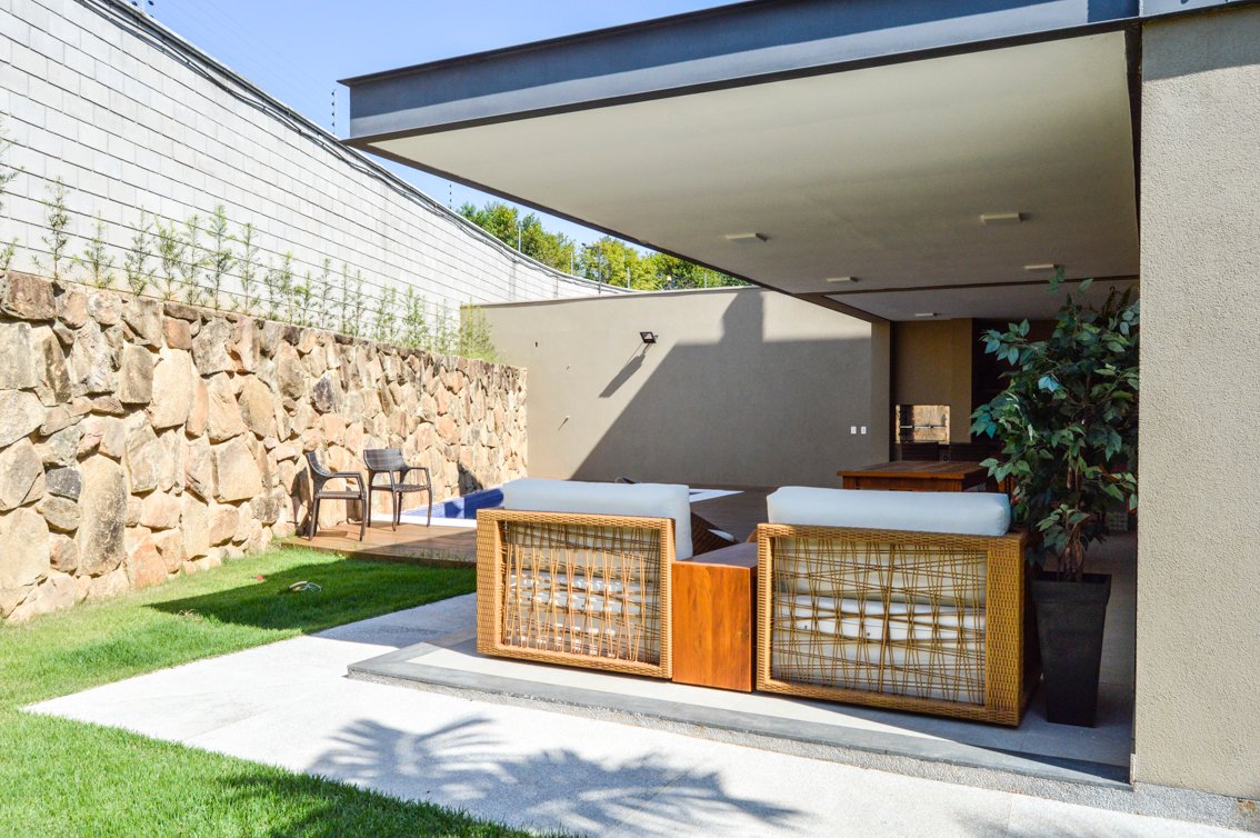 A área gourmet é marcada por uma viga perimetral de metal, que complementa o estilo da fachada, e um forro de gesso que confere um acabamento clean e sofisticado. No fundo, um muro de pedra adiciona textura e naturalidade ao ambiente. A área externa é composta por um deck de madeira que se estende ao redor da piscina, criando um espaço perfeito para lazer e convivência.