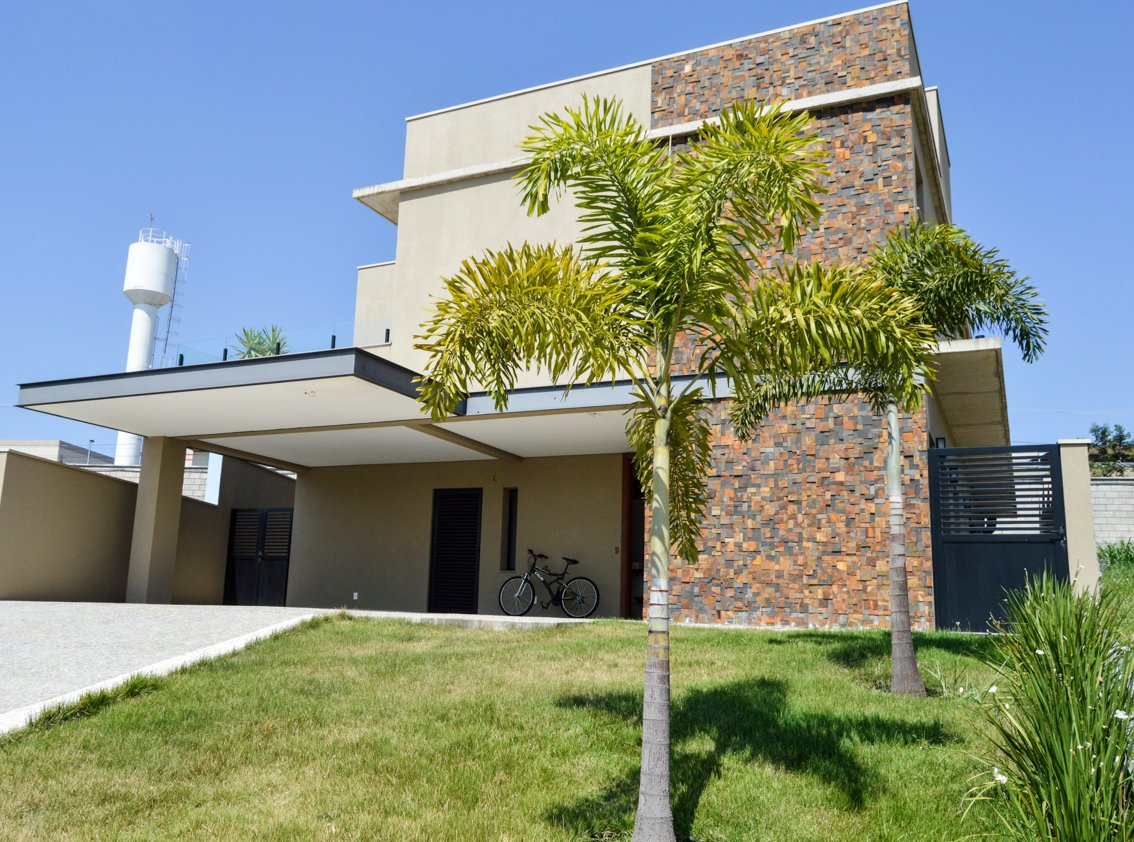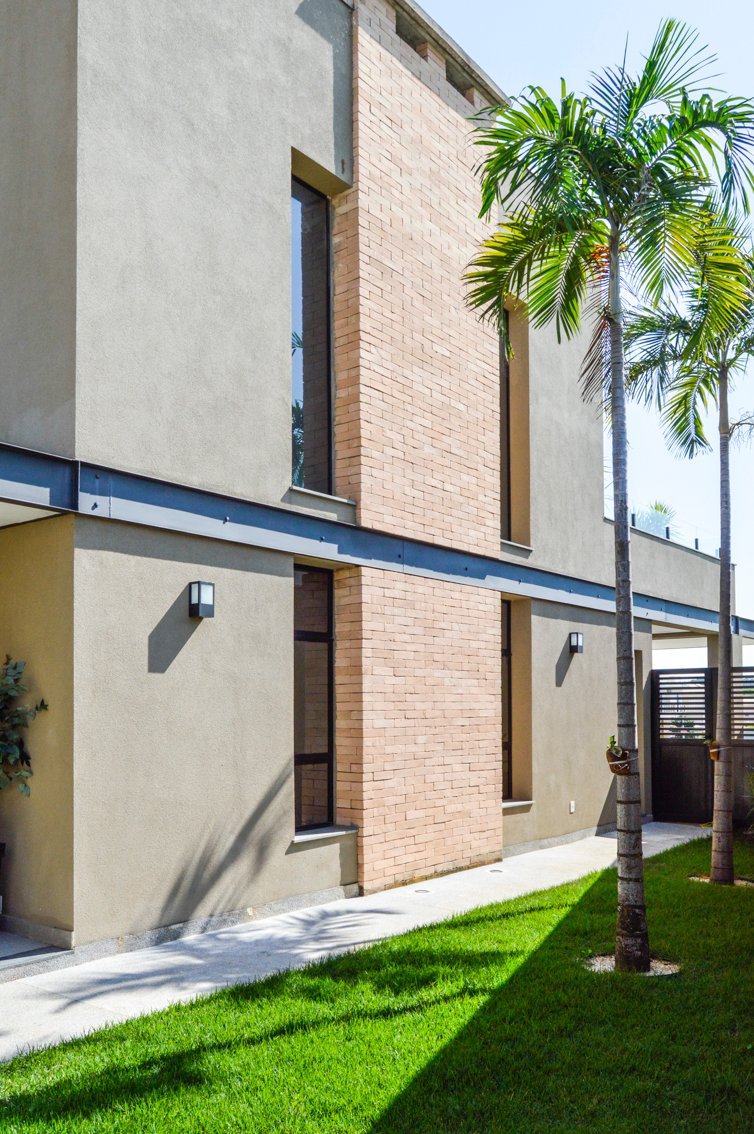 Esta casa, com telhado embutido, apresenta uma fachada sofisticada e moderna, com um revestimento que destaca a combinação de tons de cinza claro e marrom corten. A viga perimetral de metal, pintada de preto, traz um contraste elegante, realçando a estrutura e conferindo um toque contemporâneo à fachada.