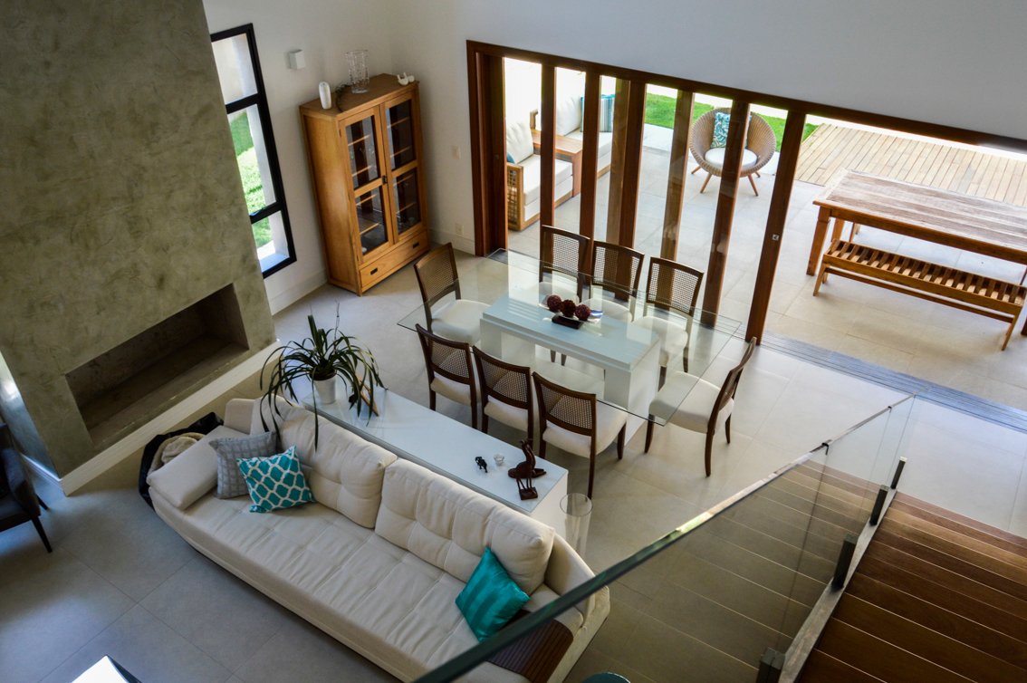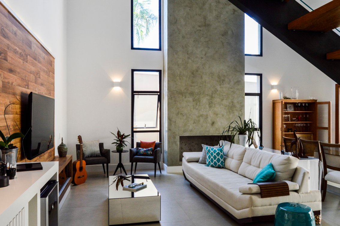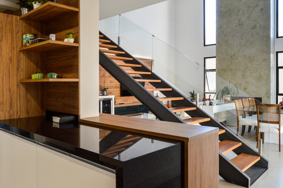 No interior, a escada é um dos principais elementos de destaque, com pisantes de madeira e sem espelhos, criando um visual leve e fluido. A estrutura de metal nos dois lados da escada complementa o design moderno e minimalista, enquanto a ladeira no pé-direito duplo, com acabamento em cimento queimado, traz um toque de amplitude e modernidade ao espaço. Ao lado da lareira, grandes janelas permitem a entrada de luz natural, integrando o interior com a natureza externa.