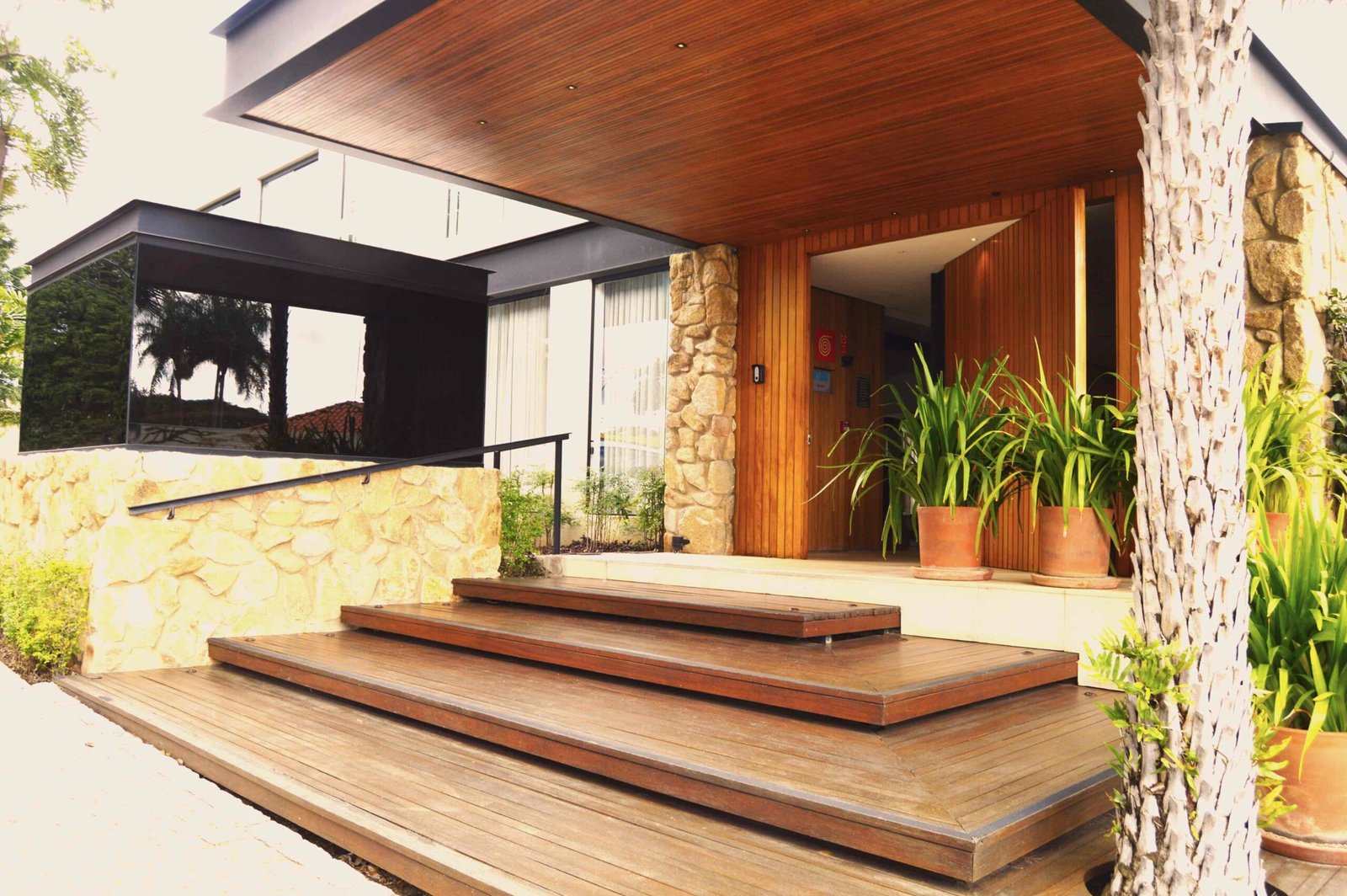 A entrada do instituto é imponente, com degraus de madeira que guiam os visitantes para o interior, proporcionando uma sensação de acolhimento e conexão com a natureza. A porta de entrada, mimetizada e ripada de madeira maciça, se integra perfeitamente à fachada, criando um efeito visual fluido e elegante, sem perder a funcionalidade.