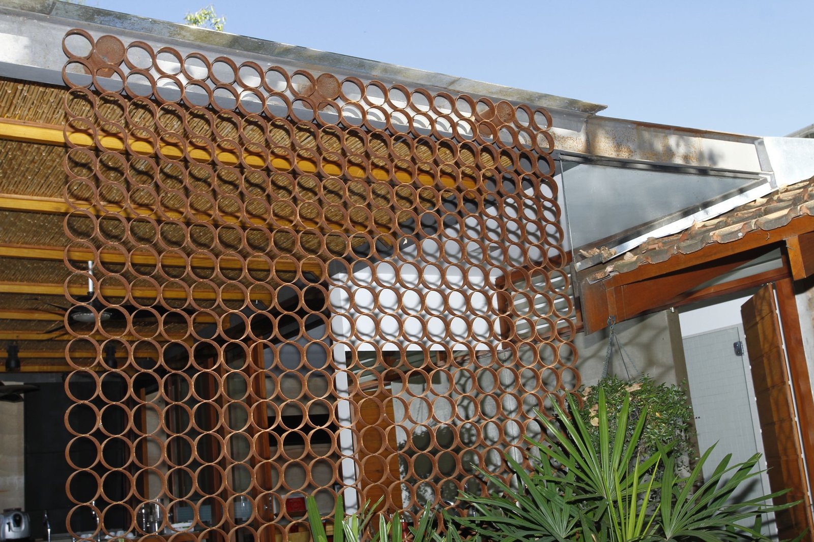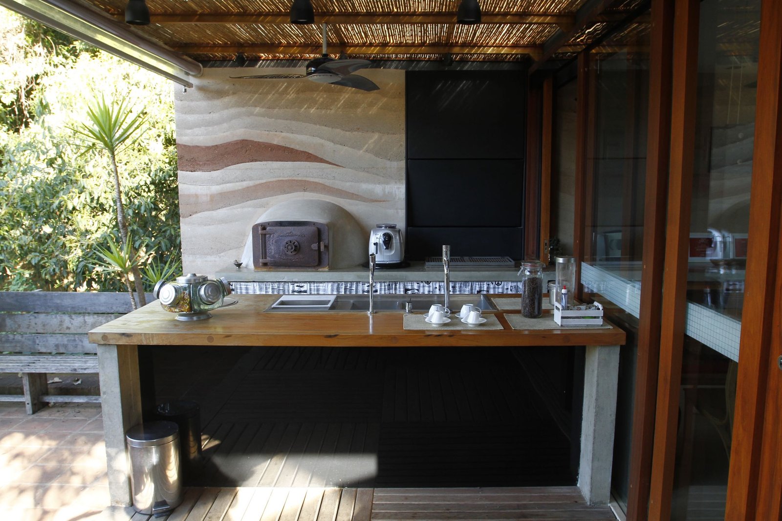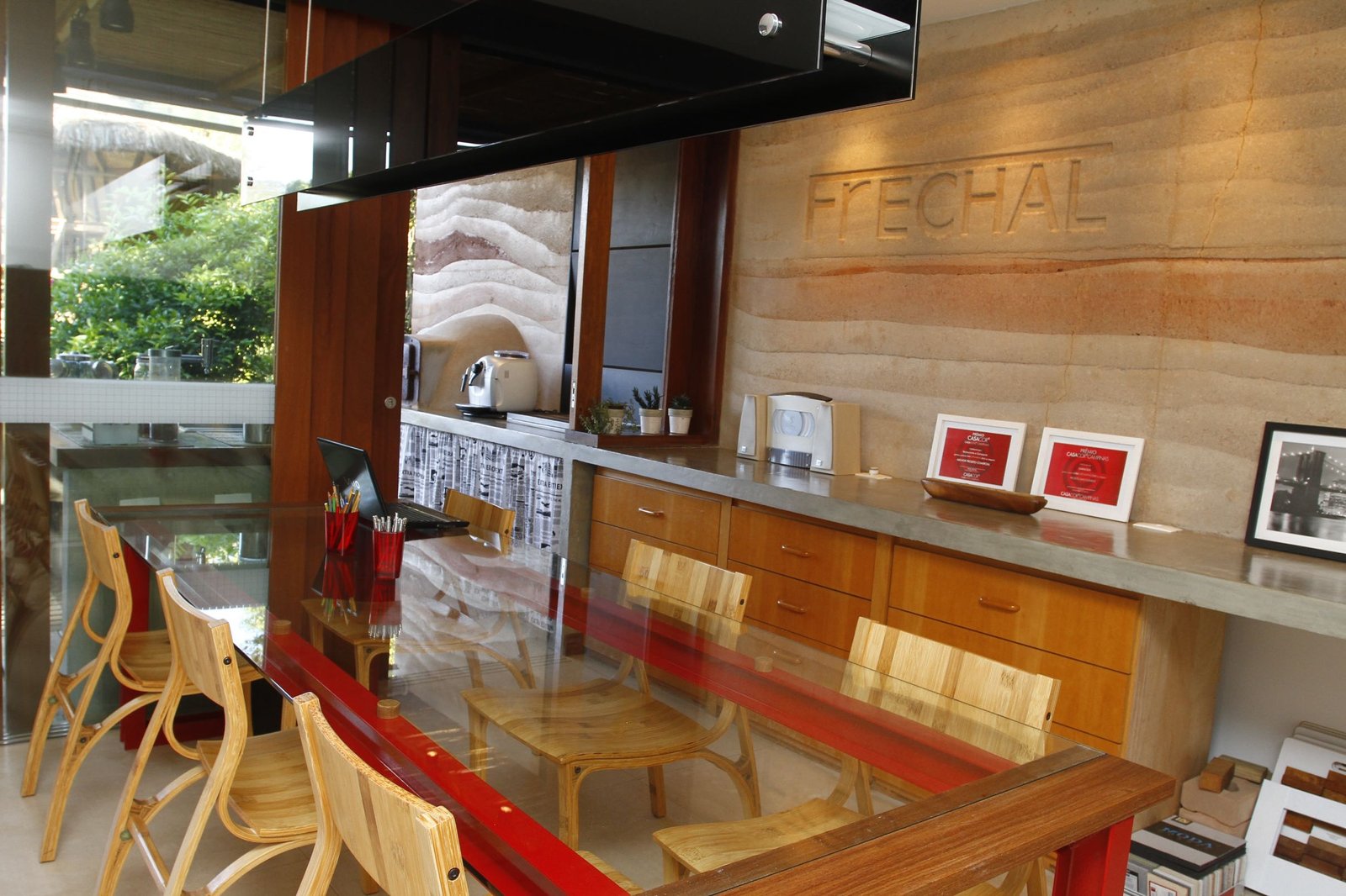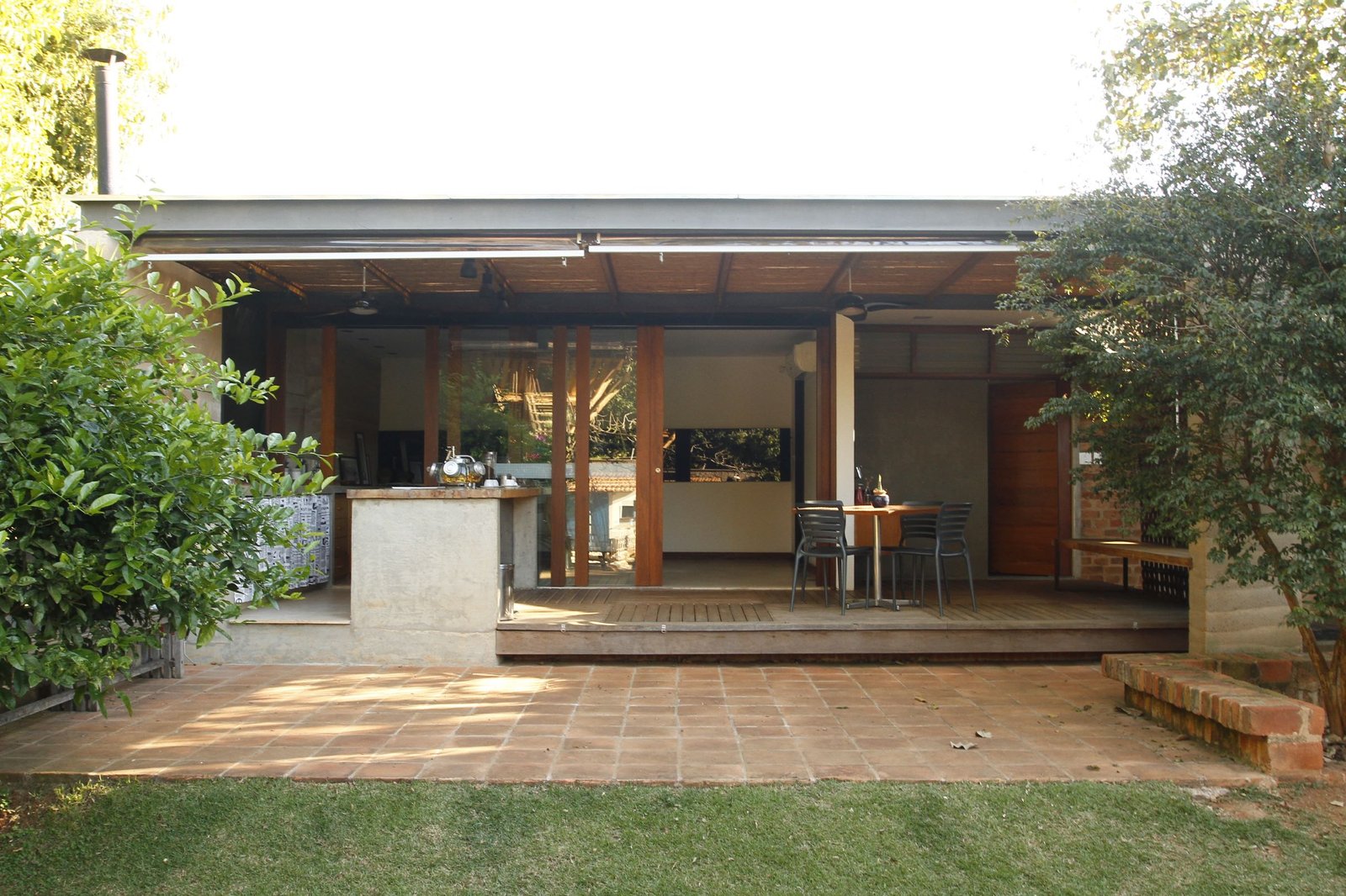 O espaço do escritório é marcado por móveis planejados, projetados pelo próprio escritório, que otimizam o uso dos ambientes com elegância. Uma parede de taipa na área gourmet é o destaque, remetendo às origens históricas do casarão. As bancadas, tanto na cozinha quanto na área gourmet, são feitas de concreto, reforçando a estética industrial e atemporal.