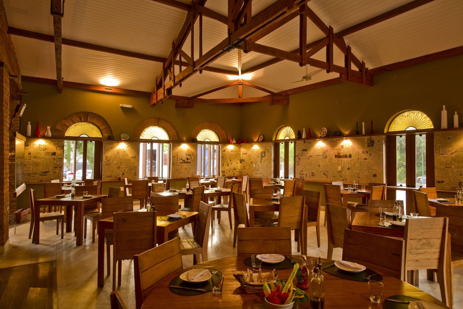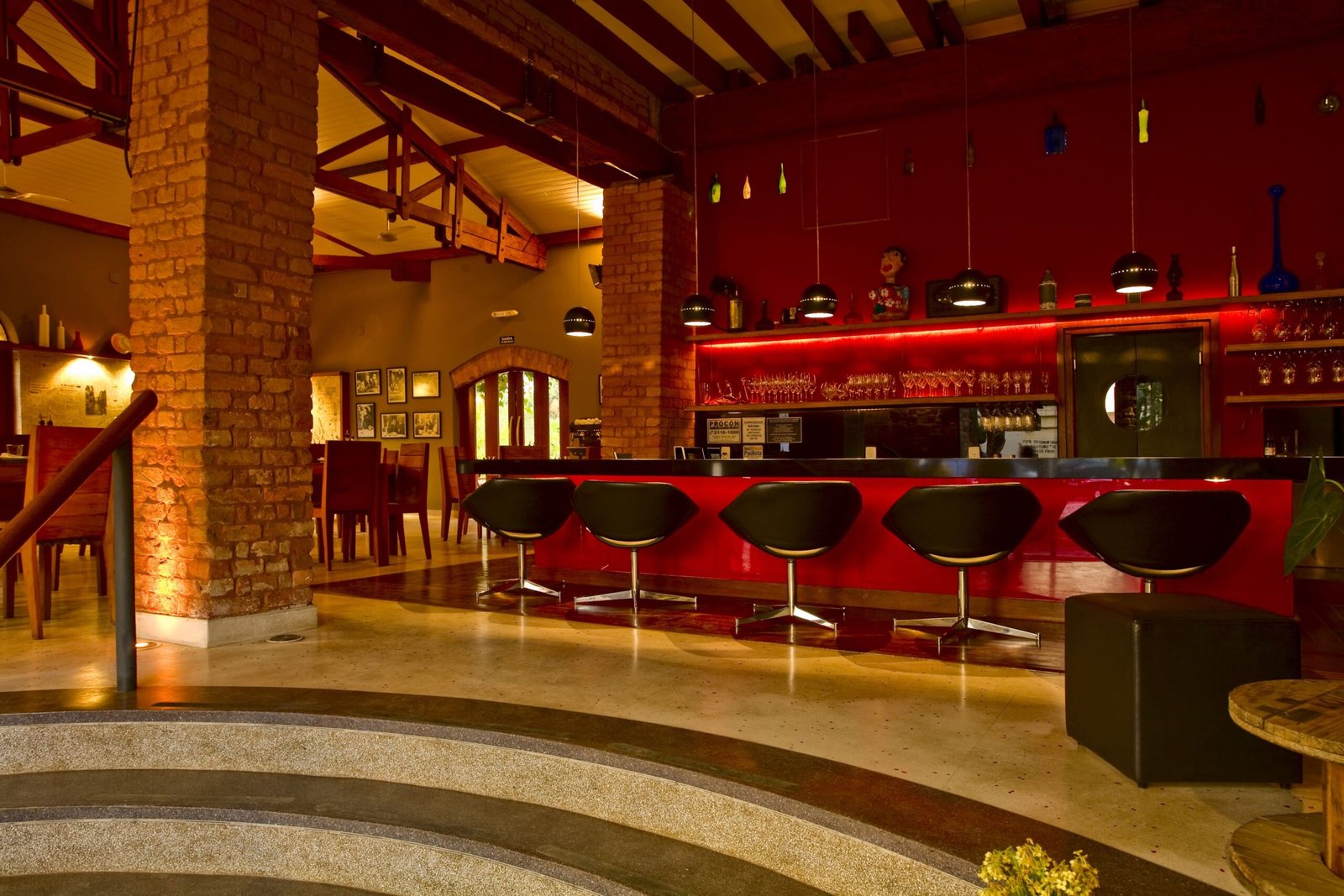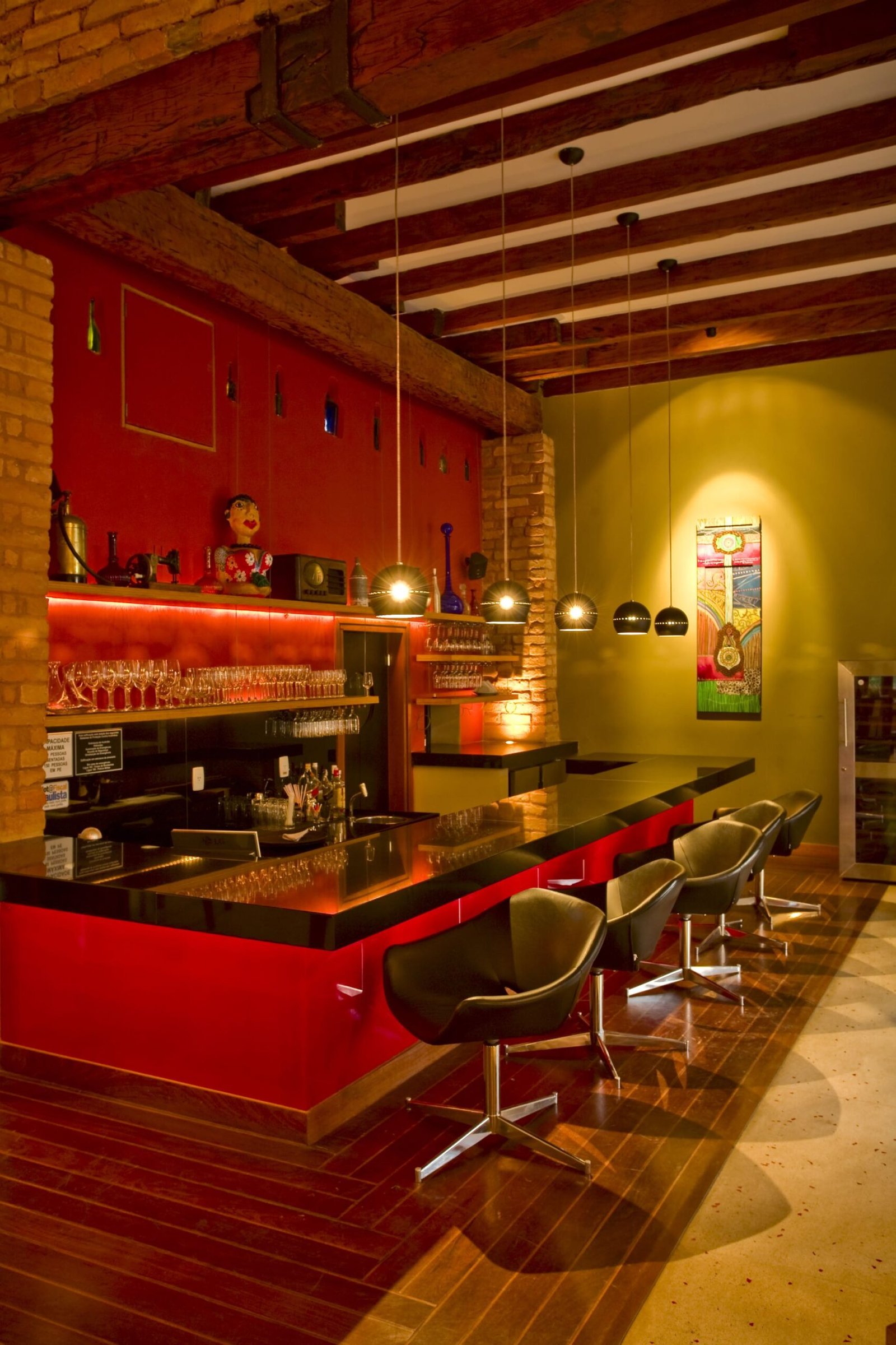 No restaurante, o charme histórico é preservado nas janelas em arco, que são um dos elementos originais do casarão. O novo forro branco, combinado com vigas de madeira aparente originais, confere amplitude e um toque rústico sofisticado. A área do bar, localizada em um nível mais baixo que o piso do restaurante, cria uma separação visual interessante. O tom predominante do bar é o vermelho, adicionando energia e um contraste vibrante ao espaço.